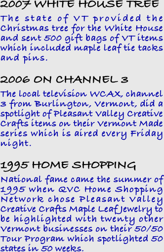 National fame came the summer of 1995 when QVC Home Shopping Network chose Pleasant Valley Creative Crafts Maple Leaf Jewelry to be highlighted with twenty other Vermont businesses on their 50/50 Tour Program which spotlighted 50 states in 50 weeks.