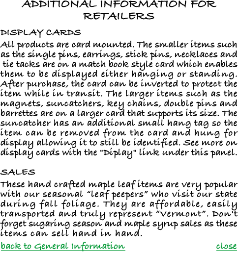 These hand crafted maple leaf items are very popular with our seasonal �leaf peepers� who visit our state during fall foliage. They are affordable, easily transported and truly represent �Vermont�. Don't forget sugaring season and maple syrup sales as these items can sell hand in hand.